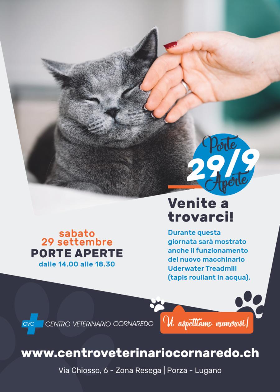Il Centro Veterinario Cornaredo è lieto di annunciare la giornata di porte aperte della sua nuova sede di via Chiosso 6, alla Resega di Porza (Curva Nord, pista della Resega), che si svolgerà sabato 29 settembre 2018, dalle 14:00 alle 18:30.
